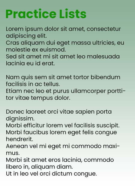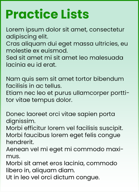 Practice ListsLorem ipsum dolor sit amet, consectetur adipiscing elit.Cras aliquam dui eget massa ultricies, eu molestie ex euismod. Sed sit amet mi sit amet leo malesuada lacinia eu id erat. Nam quis sem sit amet tortor bibendum facilisis in ac tellus. Etiam nec leo et purus ullamcorper porttitor vitae tempus dolor. Donec laoreet orci vitae sapien porta dignissim. Morbi efficitur lorem vel facilisis suscipit. Morbi faucibus lorem eget felis congue hendrerit. Aenean vel mi eget mi commodo maximus. Morbi sit amet eros lacinia, commodo libero in, aliquam diam. Ut in leo vel orci dictum congue. |